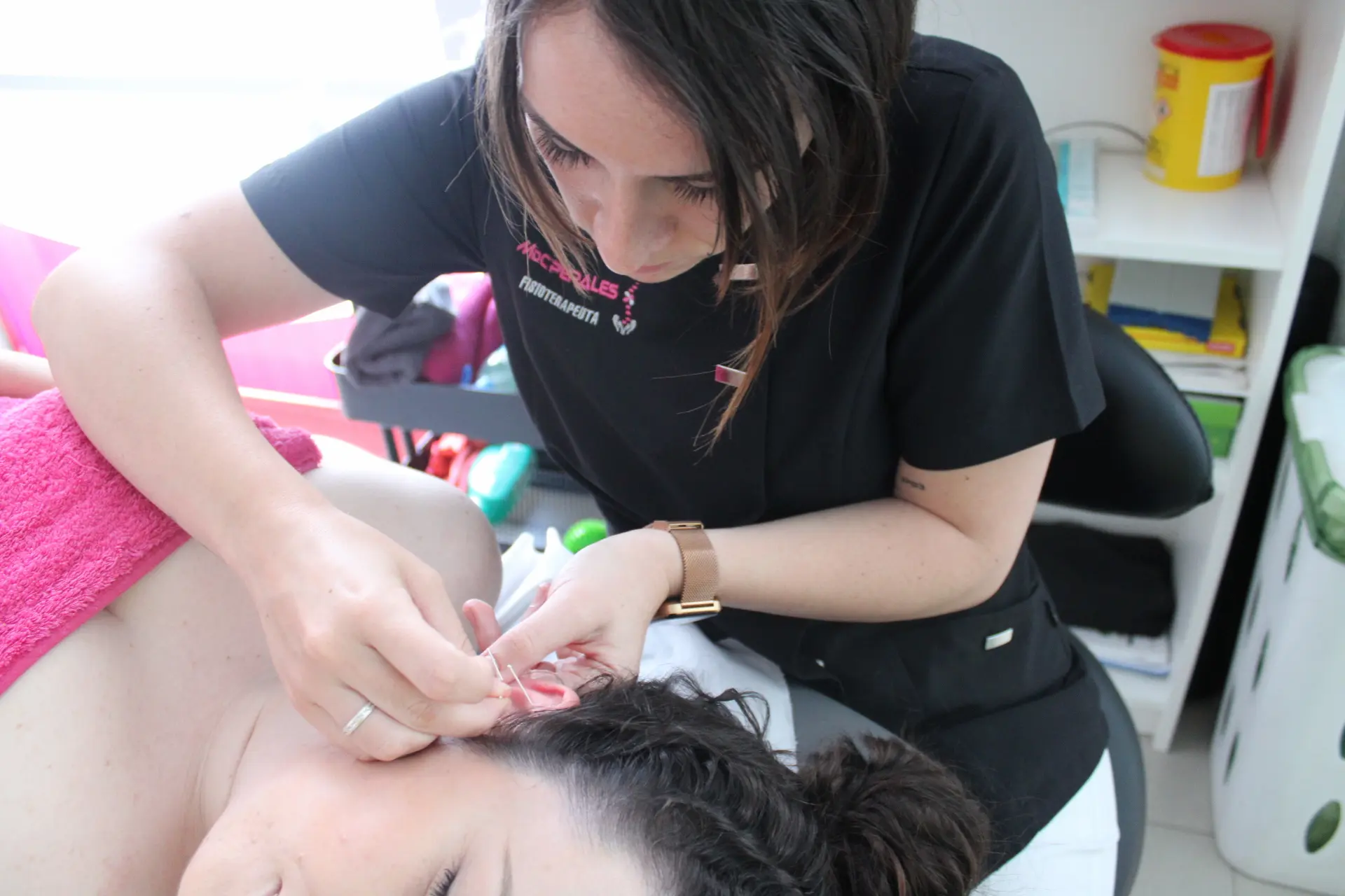 La auriculoterapia, se utiliza como un tratamiento complementario cuando es necesario, junto con la sesión de fisioterapia y osteopatía.